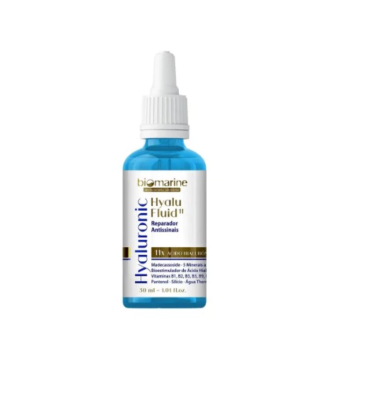 BIOMARINE HYALU FLUID 11 é um reparador antissinais ultra inovador e potente porque é composto por 11 moléculas diferentes de Ácido Hialurônico, capazes de atuar desde as camadas mais superficiais até as mais profundas da pele, reparando os sinais de envelhecimento e preenchendo as linhas de expressão.